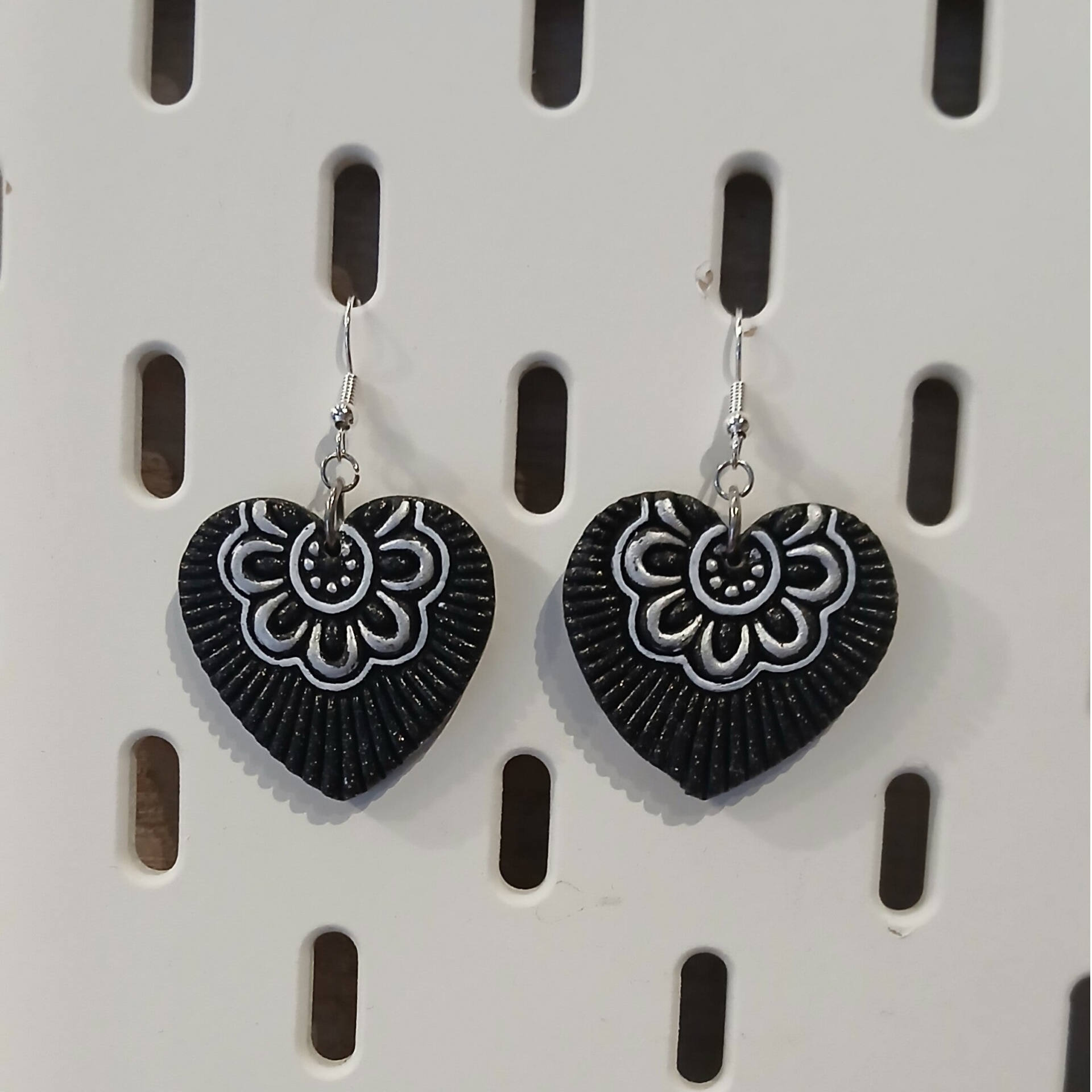Hopeat korvislenkit. Polymeerimassasta, lakattu. Sopii nikkeliallergisille. Kokonaispituus 5,2cm, leveys 3,3cm.
